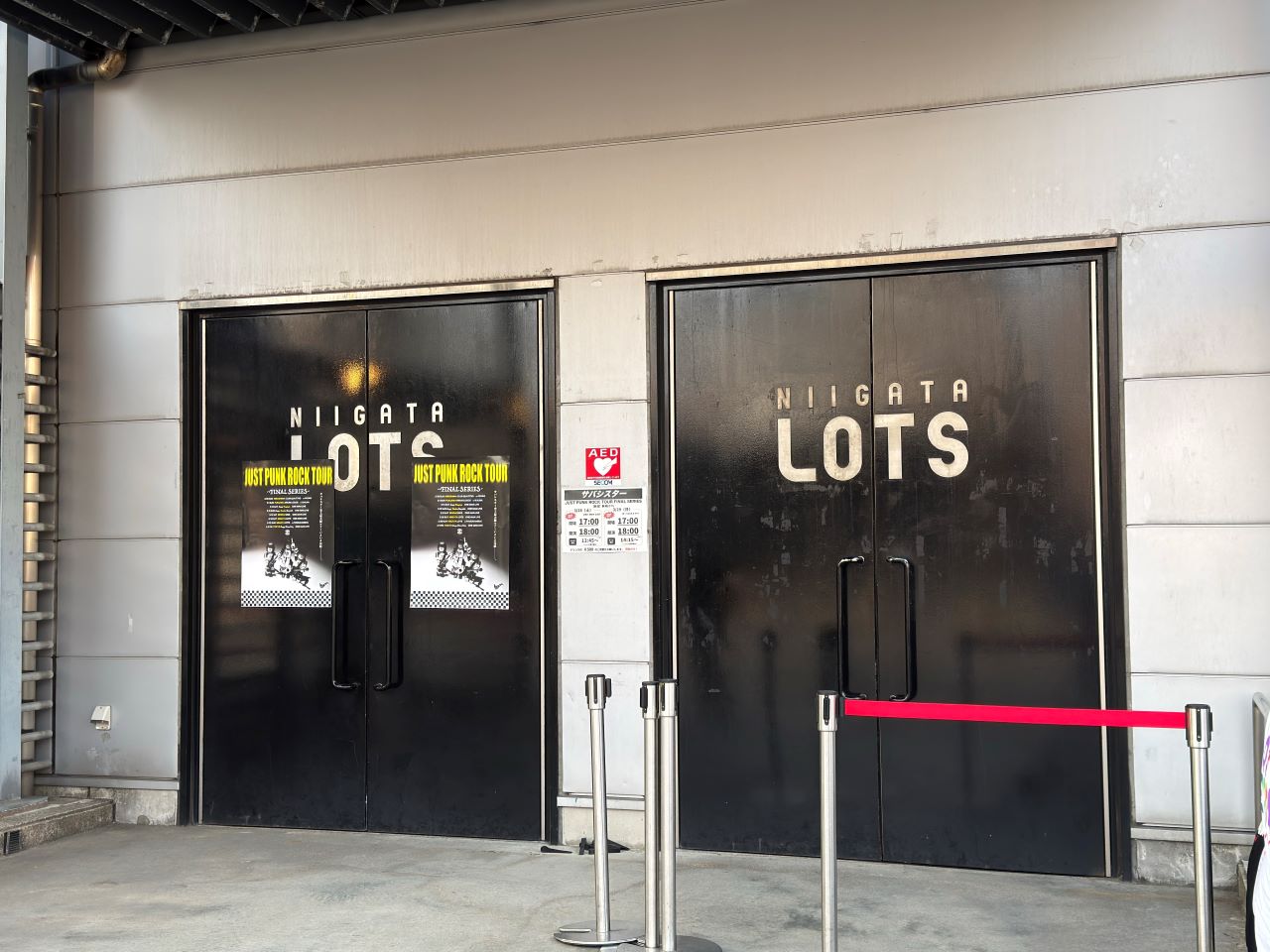 新潟LOTSは1年半ぶり、700人キャパでソールドアウト、私の整理番号はちょうど真ん中くらいでした。会場限定のオレンジTは早々に売り切れているようです。入場しサバカードでステッカーをいただき、ドリンク代は500円で前回と同様ソフトドリンクのみ、ちょうどアルコールを抜きたかったので良かったです。入場後は少し空いている下手側へ、かなり前までスペースがあったのでできるだけステージ近くへ行きます。ステージには白い幕がかかっており、BGMはThe Clash、Green Day、Rancid、No Use for a Name、The Offspring、blink-182など少しレトロな洋楽が流れています。幕の向こう側でサウンドチェックが始まり、いよいよ開演です。
