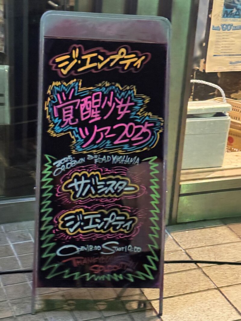 こんにちは、みたらしゴローです。今日はF.A.D YOKOHAMAでのジ・エンプティのツアー、サバシスターとの対バンです。仕事を少し早上がりして横浜へ向かいました。石川町駅のコインロッカーにカバンを預けて身軽になり、真ん中より前の整理番号でかなり前の方の上手壁際に位置どりました。一応ソールドアウト、若干だけ当日券ありとのことで、少しだけいつもよりゆとりのあるスペースで、前詰めアナウンスも開演直前に1回だけ。場内はサバ6:エンプティ4、女子も4割といったところでしょうか。サバシスターは昨日、韓国でのフェス帰りですね。それではライブの様子です。