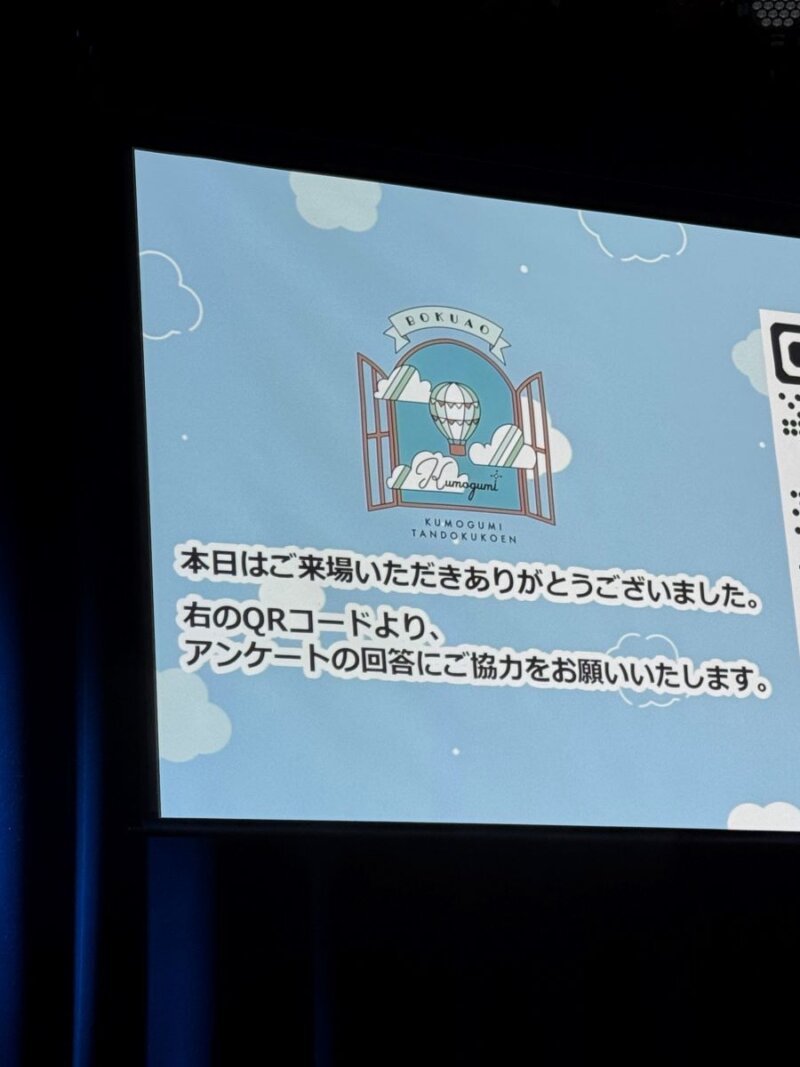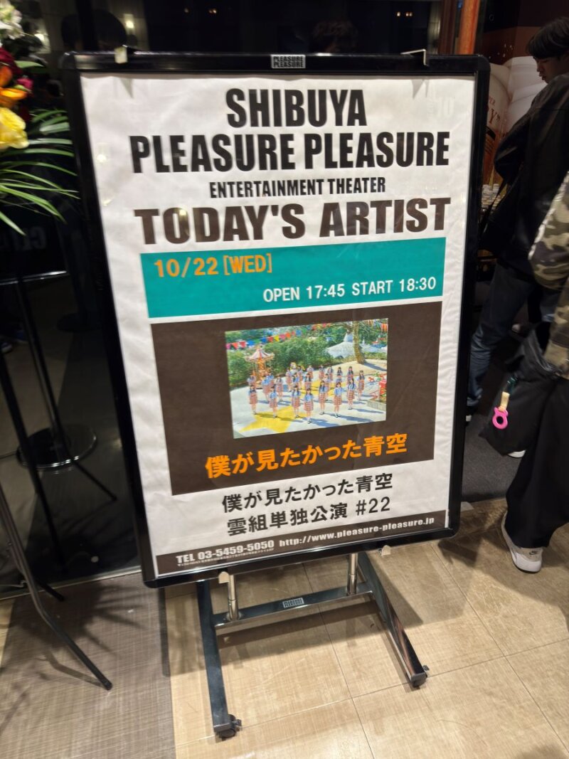 こんにちは、みたらしゴローです。今日は渋谷で行われた「僕が見たかった青空」雲組単独公演です。公式リセールでチケットを購入できました。今日は急に冬のような寒さとなり、午後から外回りの仕事を終えて会場に向かいました。寒さだけでなく、時折降る雨もこたえましたね。会場は初めて訪れるSHIBUYA PLEASURE PLEASURE。もともとコンパクトな映画館で、ラッキーなことにかなり前方の席を確保でき、ステージはすぐ目の前です。これは楽しみですね。それではライブの様子です。