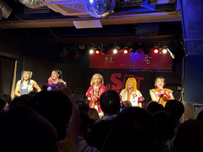 続く「NAKED BORN NAKED DIE」では、メンバーの鬼気迫るパフォーマンスに狭いフロアがナーナナの大合唱と肩組みで揺れます。「みんなで踊ろうぜ!」と「ザ・ストレンジャーズ」へ。SU-RINGの歌が上手くなったように感じられ、「オイオイオイオイ!」の大声援が響きます。フロアのあちこちから「いいよ!」「今日いいじゃない!」の声が漏れ、顔芸がかわいらしい「VISITOR」などへと続きます。