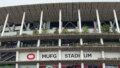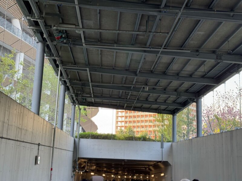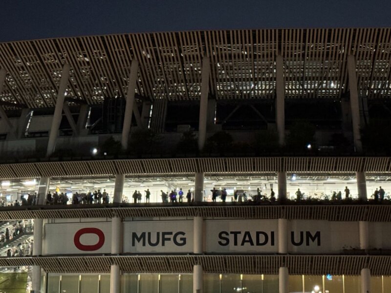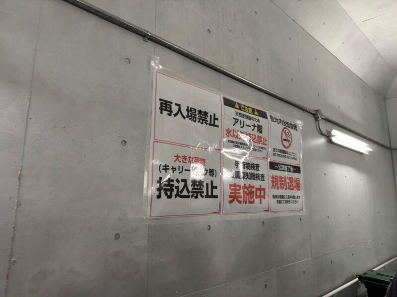 明治神宮外苑軟式グラウンドなど周囲はすごい人出でした。自席はアリーナだったため、アスリートゲートから入場。競馬場の通路のような地下道をクネクネと進み、どんな構造なのだろうと不思議に思いながら歩いていると、水以外持ち込み禁止の案内がありました。大量の難民がドリンクを一気飲みして別れを告げています。事前確認不足でしたが、これはトイレ問題に加え、気温が27℃まで上がったこともあり、熱中症が心配になりました。