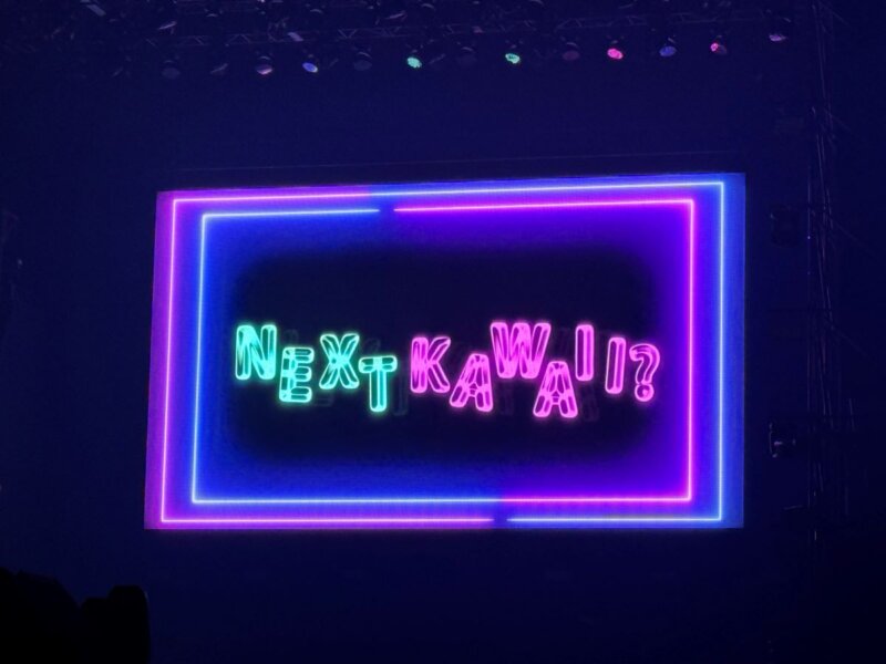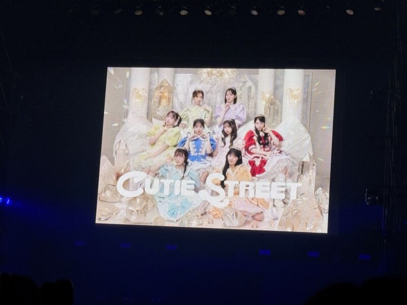 続いてのNEXT KAWAIIはCUTIE STREETです。SEとともに丈の短い大きめのリボンが目立つパンクリボン衣装“ちょいワル仕立て”で登場し、後ろ向きで整列しました。後頭部にも大きなリボンが付き、今日はメンバーのヘアアレンジもとても印象的です。ツインテールの古澤里紗の発声で始まる「かわいいだけじゃだめですか?」では、いきなりランウェイを下りセンターステージへ。間近で観るメンバーはやはりとてもかわいいです。青のTシャツを着ていたため、ハイツインテールの増田彩乃と何度も目が合った気がしてたまりませんでした。