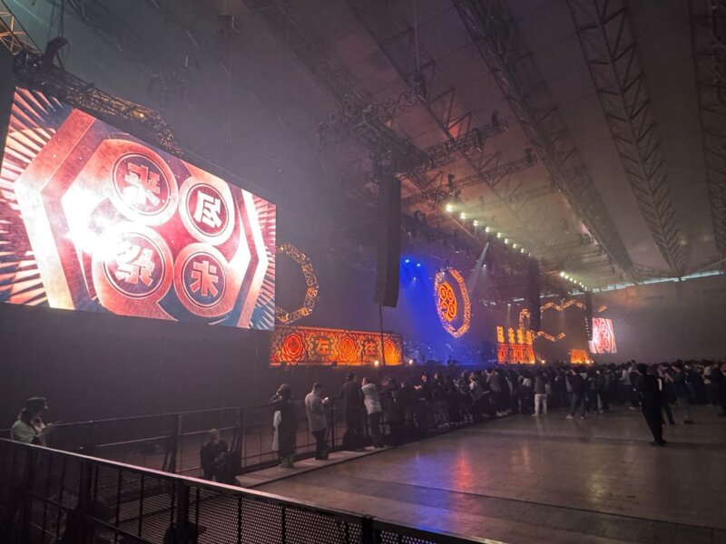 場内は、2階エスプラナードがクローク、地上階には11ホール側と屋外に物販とオフィシャルバーが設置されています。幕を挟んだ9ホールの突き当たりには、左右2ステージが構成されており、両サイドには簡易スタンド席も設けられていました。下手側の屋外軒下にはフードエリアがあり、多数の店舗が出店していました。それでは、ライブの様子をお届けします。