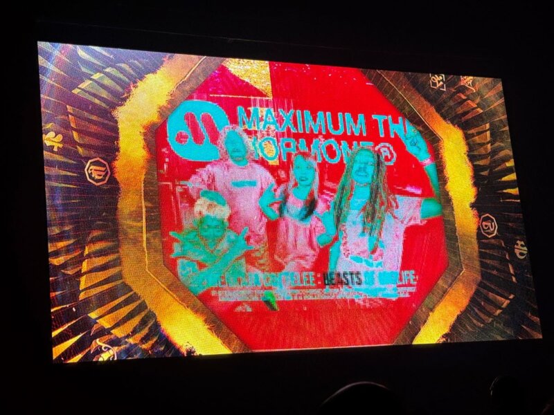 「ロンちゃんにリクエストされて、MAKOTOさんも好きな曲を」と紹介して始まったのは、スクリーンに巨人が迫る映像が流れる「The Rumbling」。MAHが「大丈夫ですか?おじさんおばさん多いけど、まだいける!?」と煽ると、次は「DO THE DANCE」。スクリーンには猿が踊り狂い、フロアは大合唱とダイブの嵐に包まれます。続けて「THE KiNG」ではスクリーンが王冠に変わり、さらに熱気を加速させました。