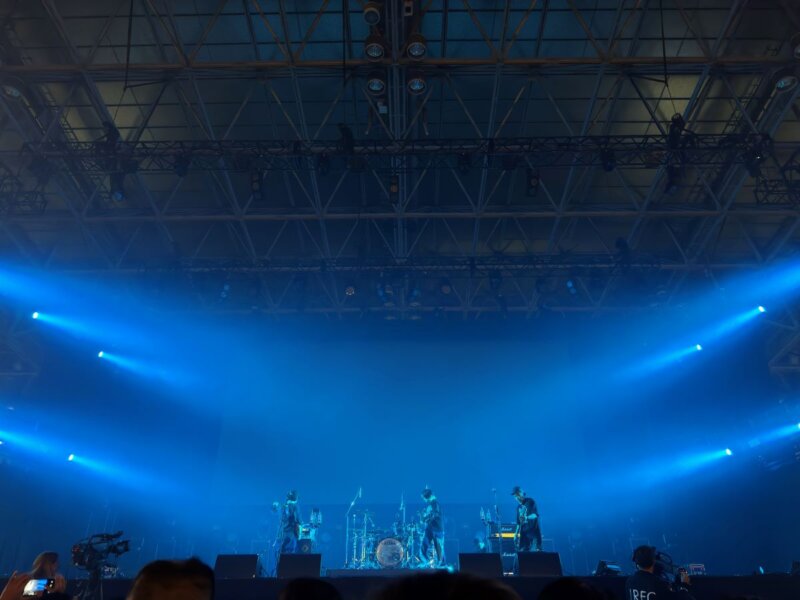 EARTH STAGE前方当選のヤバイTシャツ屋さんです。ど中央一桁列目という最高の場所でした。早々にメンバーが現れてサウンドチェックが始まります。ありぼぼ(ボーカル・ベース)は復帰後、初めて観ましたが、ピンクの「今更・今尚道重」Tシャツに綺麗な金髪で相変わらず元気な姿をみせ。いつも通り真っ黒な牧師のような衣装のこやまたくや(ボーカル・ギター)が「前方エリア入ってきてる!」ありぼぼも「フードエリアの人たち!」「前の人たちはご飯諦めた!?」とマイクテストを兼ねてフロアをいじります。リハーサルが始まり、「ヤバみ」「すこ。」「とりあえず噛む」と本番さながらに合わせ、「4分後に戻ってきます」と一旦捌けました。