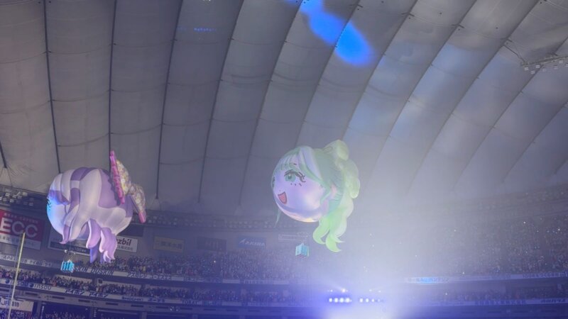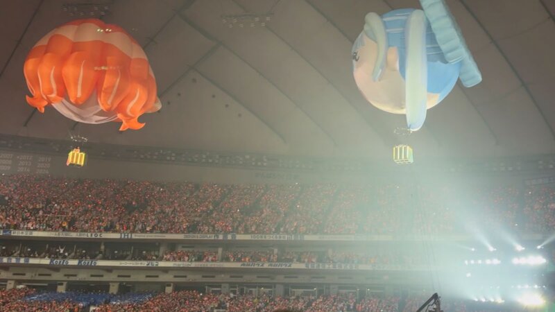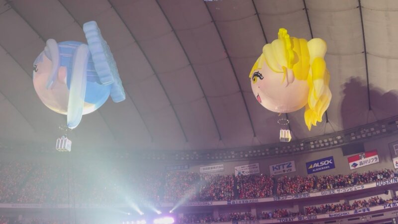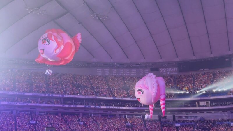 再びVTRに入ります。宇宙船内の設定で「私のモニターまだおかしいんだけど」「頑張るから見てて」「直った!?」「いや無理です」などのやり取りが続き、仲川瑠夏のモニターで見ようという流れで全員がのぞき込みます。そこから初ライブ以降のライブ映像が流れ、ファンがどんどん増え、2年目で日本武道館、3年目でさいたまスーパーアリーナと会場規模が大きくなり、目標を達成していく歩みが映し出されます。さらに一昨年の紅白落選から海外公演、1年を経て紅白出場へとつながる軌跡も紹介され、またも涙を誘います。よし、みんな惑星Dに降りよう、もっとENERGYが欲しい、5万人乗っても大丈夫!という掛け声で飛び立ちます。すると再び気球に乗ってメンバーが登場します。オープニング同様ですが、松本かれんの気球だけ少し高度が低めです。気球から「NEW KAWAII」でライブが再開されます。松本かれんのセリフパートでは「デビュー3年目で東京ドームに連れてきてくれた、ふるっぱーのみんながNEW KAWAIIと思います!」と叫び、会場が沸きました。ここから撮影可能タイムとなり「ピポパポ」を披露します。途中で左右の花道に着陸してパフォーマンスします。衣装はふわふわのメンバーカラードレスで、後ろのスカート丈が前より長いデザインです。