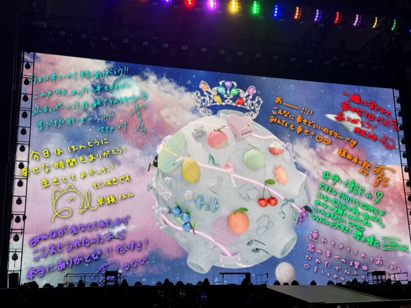 続いて「虹」でライブに戻ります。7人での楽曲を36曲披露してきましたが、最後37曲目はこの曲ですと紹介して「超めでたいソング ~こんなに幸せでいいのかな?~」を披露し、メンバーの「FRUITS ZIPPER 東京ドーム!」に5万人が「おめでとう!」の大祝福で返し、この大舞台を締めくくりました。櫻井優衣は「これで7人で全曲披露したことになります」と涙を流し、「これからも7人でたくさんNEW KAWAIIを届けられるよう頑張ります!」と宣言します。スクリーンに光が見えると「わっ、何か光った!」と全力疾走でメインステージに移動して整列し、肉声で「ありがとうございました!」と挨拶してステージをあとにしました。エンドSE代わりのVTRで「君の明るい未来を追いかけて」の一節が流れ、宇宙船が遠くへ飛び去っていきました。