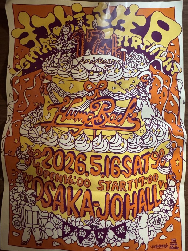 アンコールに応え再登場し、来年の大阪城ホールワンマンライブを告知。「門下生」というファンクラブの特典動画やチケットがほぼ当たることなどを説明しました。「ロックスターは27歳で死ぬらしいけど、のうのうと生きてる」と語り、「僕らは今日も車の中」。そして「うちらが大阪Hump Backでした!」とラスト、「がらくた讃歌」で締めくくりました。