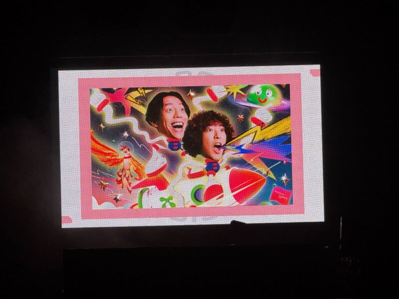 続いてのBRIDGE STAGEはanoです。バンドセットが組まれ、ジングルのあとファンタジーなSEが流れ、暗闇から照明が明るくなると、中央のお立ち台に黒いロンTにミニタイトスカート、ロングブーツ姿のanoが登場。「僕のライブは自由に踊ったり歌ったりして下さい!」と宣言し、「ちゅ、多様性。」でスタート。モニターはかわいいフォトフレームで縁取られています。